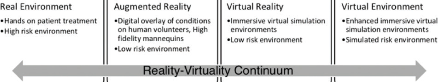 Several contexts have been identified as being highly relevant to immersive learning environments, including clinical and critical care health, automation, high-risk environments, environments that are prohibitively costly to reproduce, and educational environments that utilise simulation. These can be directly mapped to mixed or immersive reality learning environments. Figure 1 illustrates mapping of the immersive reality continuum to a continuum of risk-level learning contexts: modified from Eames and Aguayo (2019).