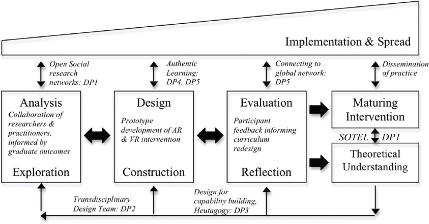 As our research essentially builds upon the foundation of mobile learning (Cochrane 2013a, 2013b), we leverage the maturing body of mobile learning research to guide the design of our projects. Cook and Santos (2016) argue that DBR provides a state-of-the-art framework for designing authentic mobile learning environments. We have chosen the McKenney and Reeves (McKenney and Reeves 2019; Reeves, Herrington, and Oliver 2005) model of design-based research. According to the McKenney and Reeves model, the four iterative stages of DBR include analysis and exploration, design and construction, evaluation and reflection, redesign and dissemination. The goal of DBR is the development of transferable design principles that can be utilised in contexts beyond that of the original research project and thus potentially generate a wide impact upon teaching and learning. For example, Narayan, Herrington and Cochrane (2019) describe the development of transferable design principles for utilising mobile devices to facilitate heutagogical learning.
