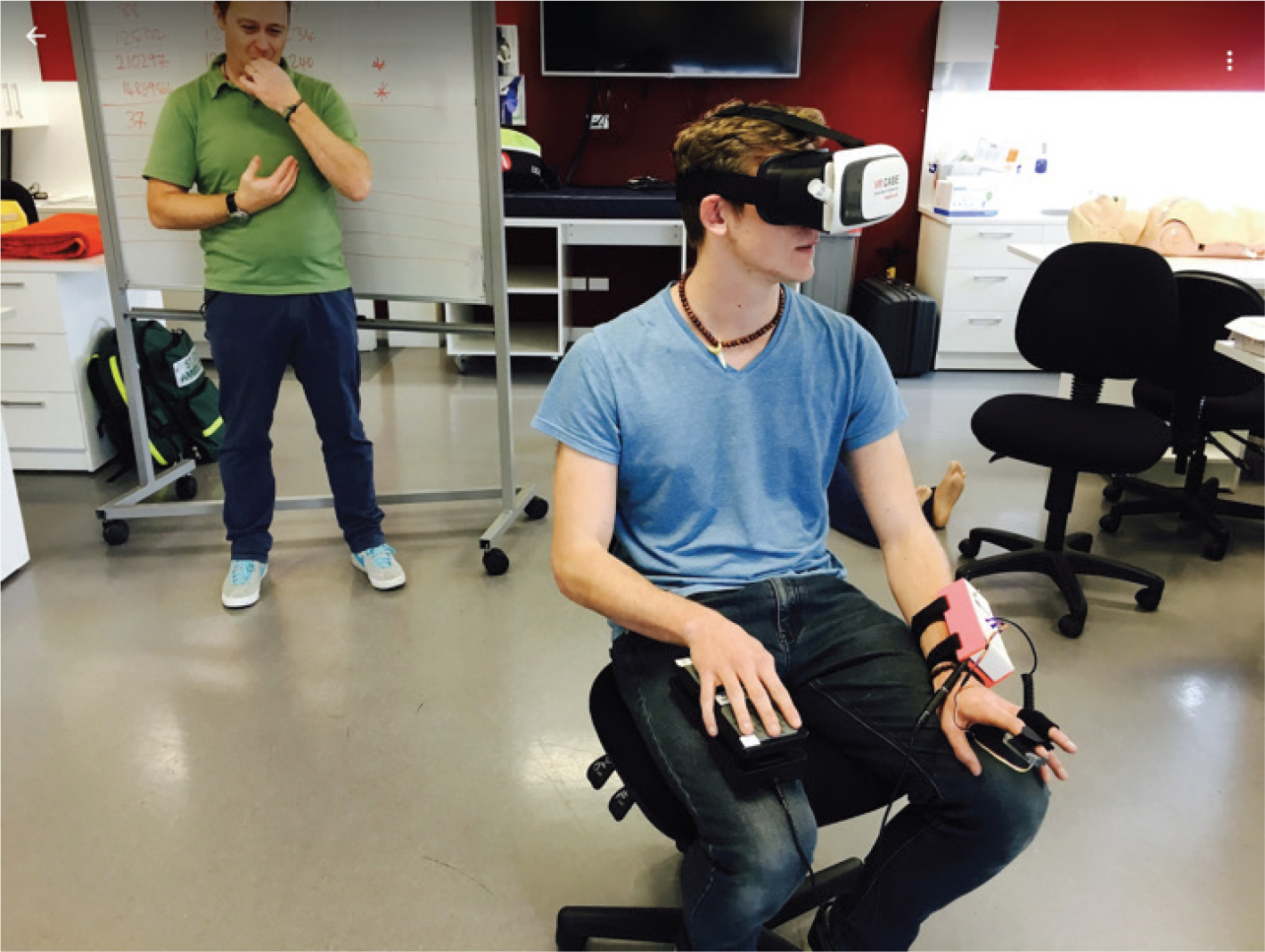 The initial project prototype was tested with 45 undergraduate AUT Paramedicine students volunteering to participate in a 1-min mobile VR simulation in August 2017 (Figure 3). Initial feedback and evaluation of the 2017 prototype experience included the need to redesign the embodied biometric instruments for ease of use and reliability; redesign of the enhanced simulation environment through adding development of multiple authentic scenarios that are linked through the VR experience; addition of new forms of user interaction; and exploring higher definition HMD. We addressed these issues in the design of the 2018 VR scenario that moved from a static 360 scenario viewed via a Google Cardboard compatible HMD to the development of a virtual ambulance callout involving a combination of 360° video and static scenario exploration via an Oculus Go HMD.
