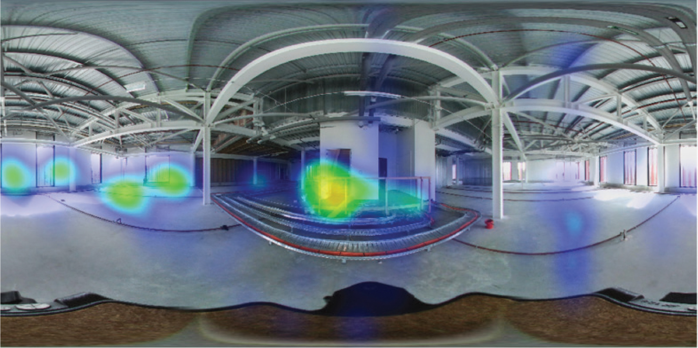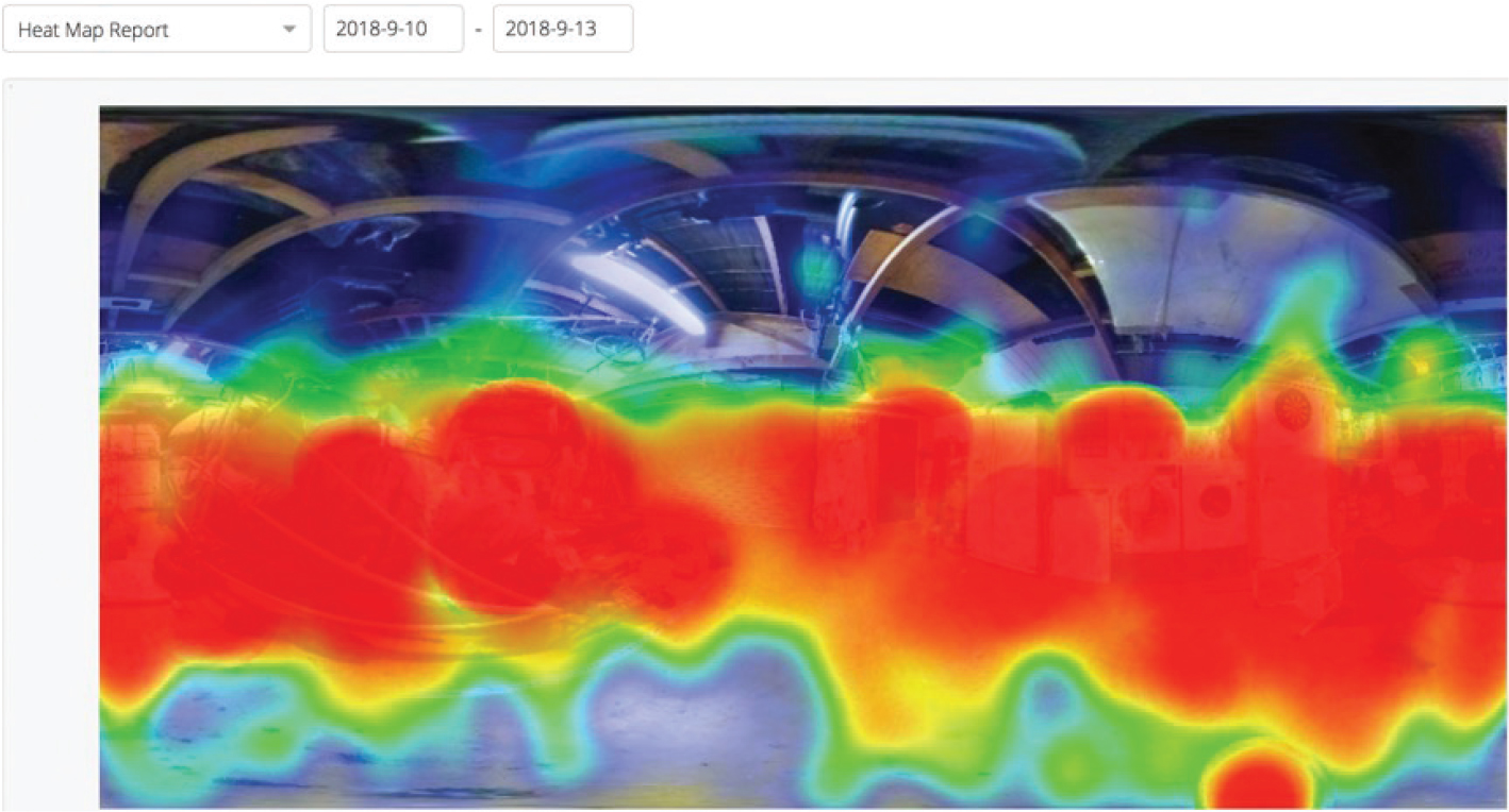 The initial prototype biometric analysis indicated that there was a definite correlation between critical incidents in the VR scenario and participant biometric stress responses. Figure 5 illustrates the data recorded by the mobile VR environment backend (Seekbeak) as a participant explored the scenario visually, showing the attention given to critical elements in the virtual environment via a gaze heat map.