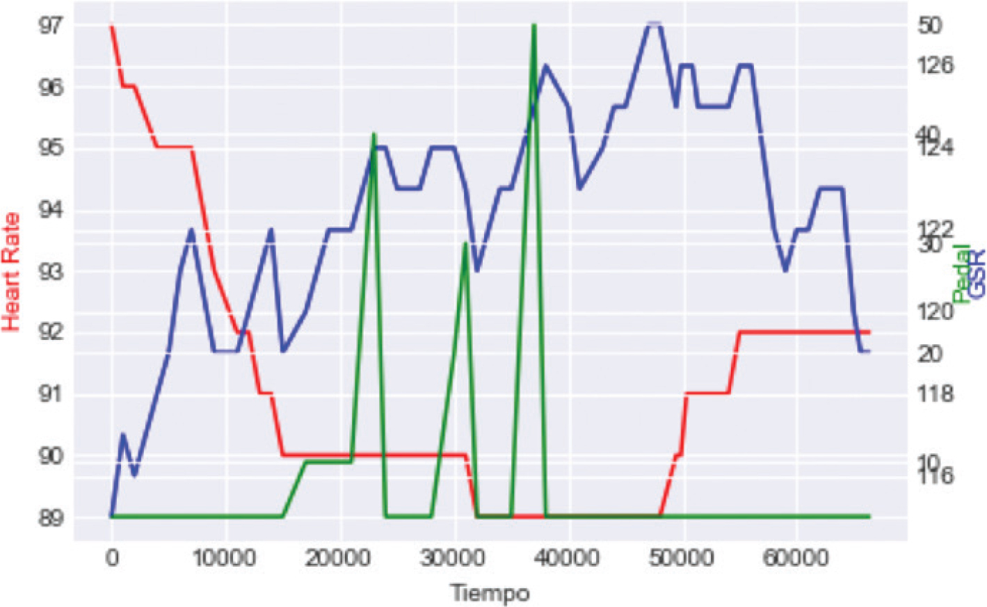 Figure 6. Example of embodied feedback data (blue = skin conductivity, green = subjective pedal and red = heart rate).