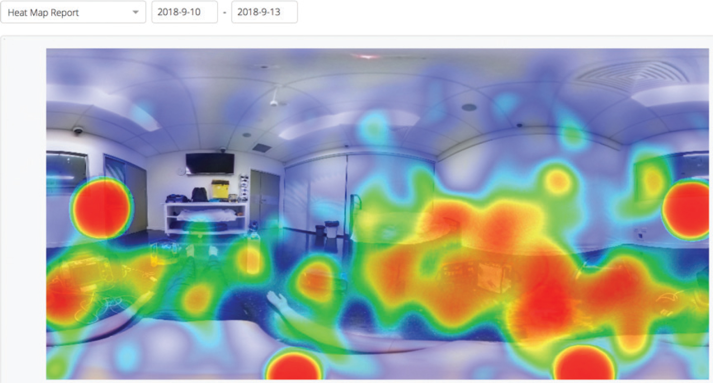 In the 360 scenario with the high-fidelity mannequin surrounded by a selection of test equipment, the eye-tracking heat map (Figure 8) indicates that participants quickly scanned the available equipment resources as they decided upon an appropriate treatment procedure.
