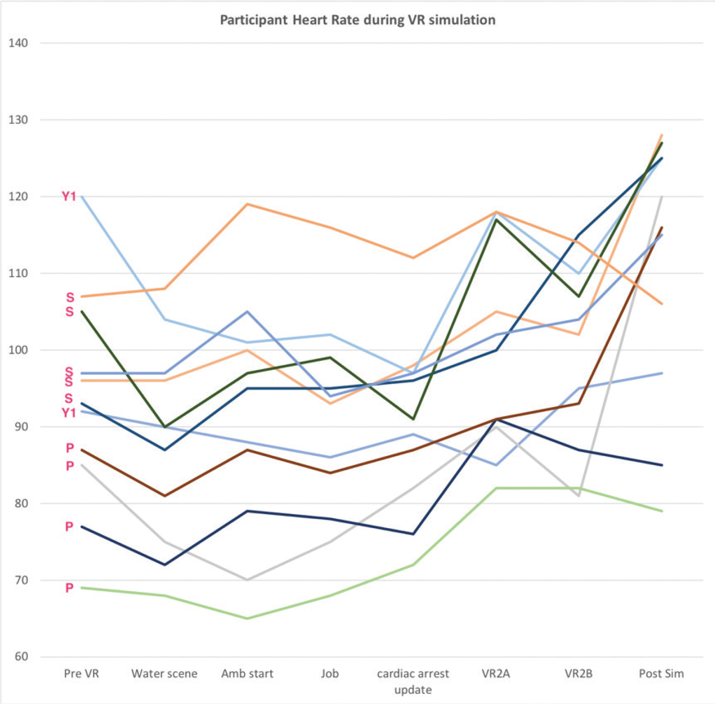 Figure 9 shows a selection of participant heart rate data (Y axis = BPM) measured via a smartwatch, and readings observed at eight different timestamps throughout the VR scenario as described in Table 2 (X axis = Pre-VR, Water scene, Ambulance start, Job notification while in ambulance, Cardiac arrest update while in ambulance, VR garage scene 2A, VR simulation room scene 2B, and post physical clinical simulation with the high-fidelity mannequin). The lowest four results are from participants who were professional Paramedics (indicated by P), while the rest were Paramedic students (S), including two first-year students (indicated by Y1). A baseline heart rate for each participant was determined during the ‘calming’ forest ‘water scene’ experience at the beginning of the VR scenario. As indicated by heart rate changes, stress levels tended to be highest in first-year students, and all student stress levels significantly increased when the job call came through in the VR scenario. There was one Y1 student ‘anomaly’ with the lowest student HR readings; however, this was from a student who was also a professional athlete. Conversely, practicing paramedics’ stress levels were the highest pre-simulation, and their stress levels tended to decrease as the VR scenario progressed. This biometric data aligned with the subjective feedback trends received from the participants through the post-simulation survey and post-simulation short video interviews.