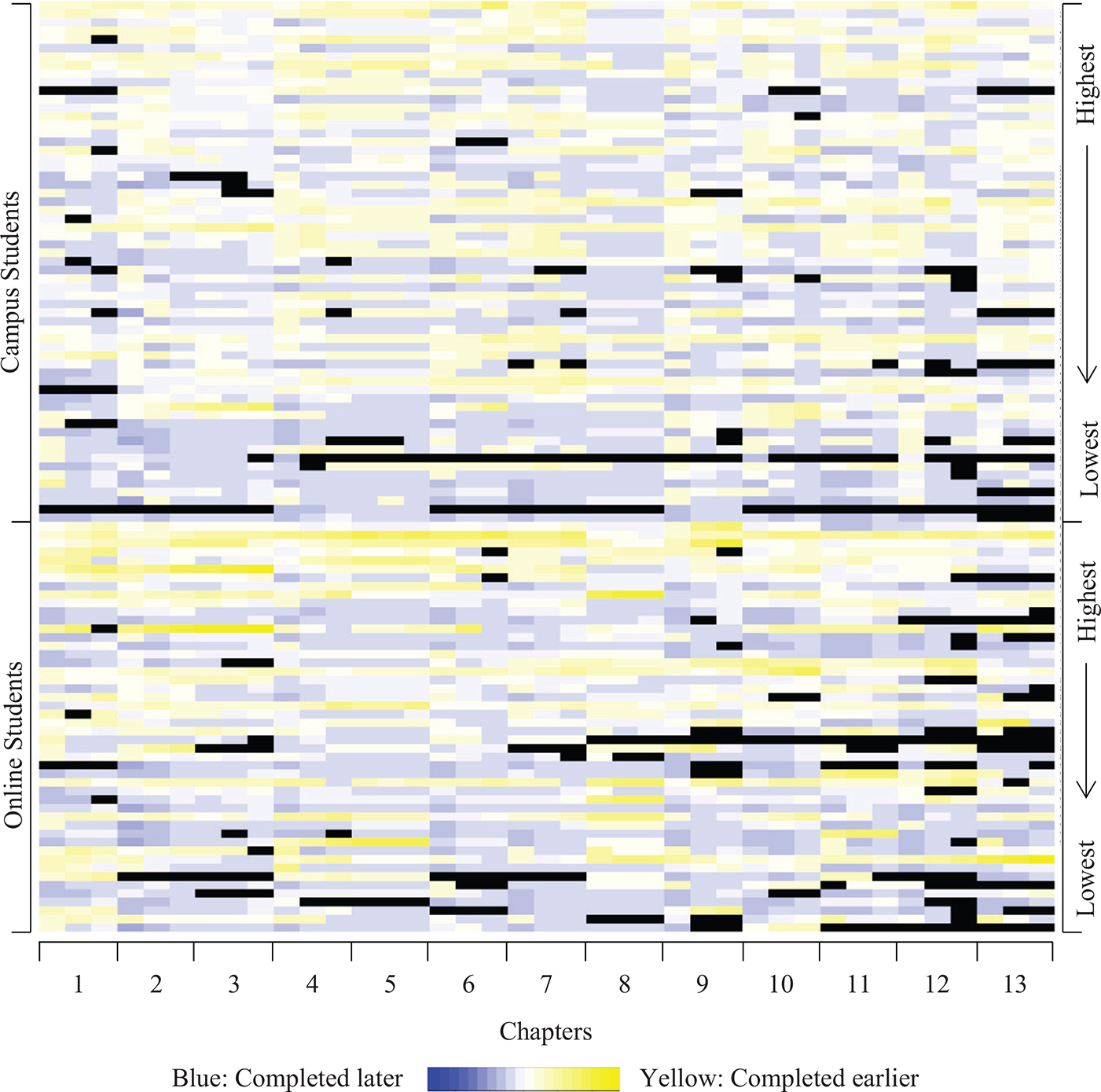 The heat map illustrates that students who did better in the course answered questions earlier (Figure 1). Furthermore, students who did poorer in the course tended to leave more questions unanswered.