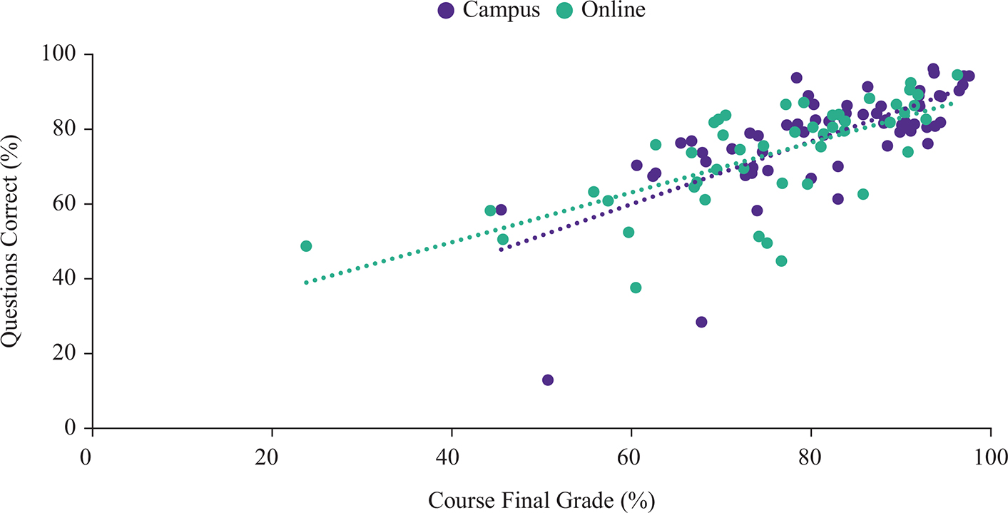 Figure 2. Campus (R2 = 0.46) and Online (R2 =0.49) course final grades versus questions correct. R2 is the coefficient of determination off of each sections trend line.