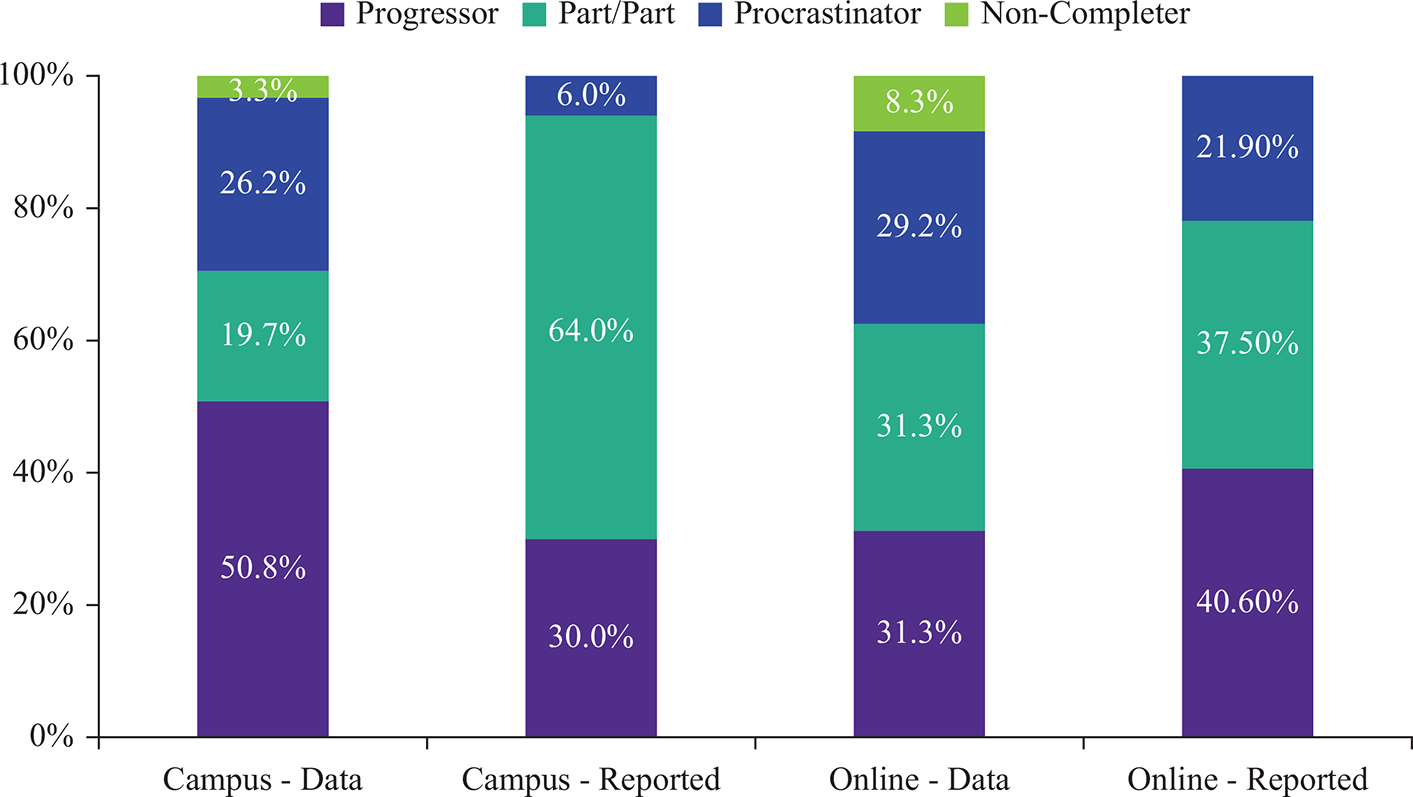 To compare survey responses with observed question progress behaviour, completion of the middle question was analysed for each student. Students who did not complete at least 10/13 of the selected middle chapter questions were considered ‘non-completers’ (campus n = 2, online n = 4). Students who answered the middle question in >72 h before the due date for at least 50% of the chapters were considered progressors. While students who answered the middle question in <24 h before the due date for at least 50% of the chapters were considered procrastinators. All remaining students were considered part progressors/part procrastinators; they either answered the middle question in 24–72 h before due date at least 50% of the time or did not fall into any category for at least 50% of the time.