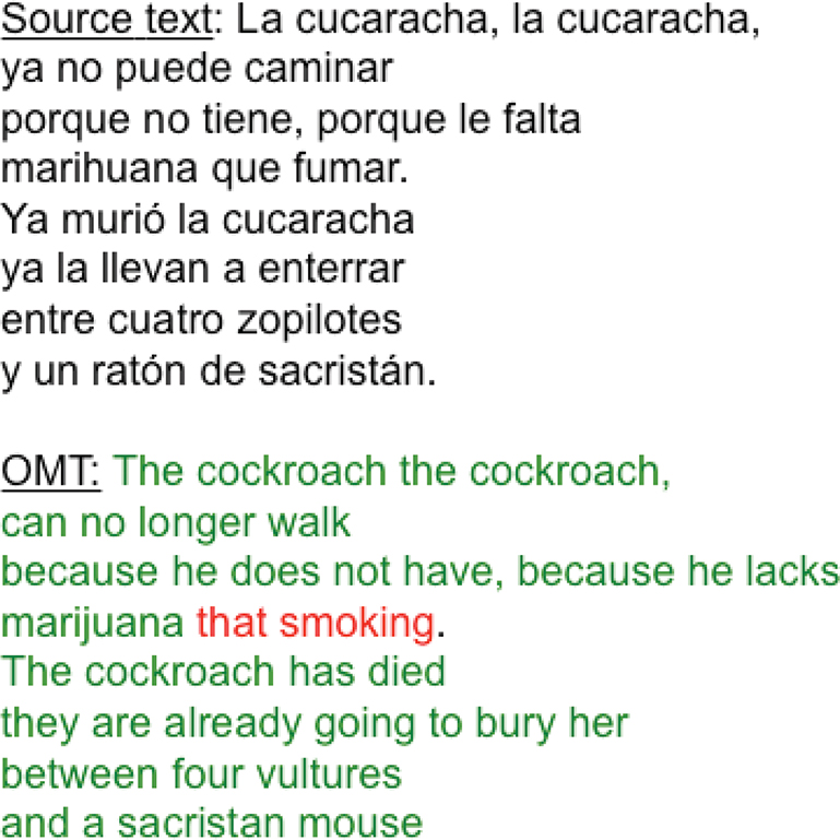 Students were great at playing and experimenting with the language. For example in Figure 6, there is an extract from a nursery rhyme containing the word ‘zopilotes’, which is common in Central American Spanish, and was well translated into English via OMT. The advanced student agreed with the OMT output’s correctness.