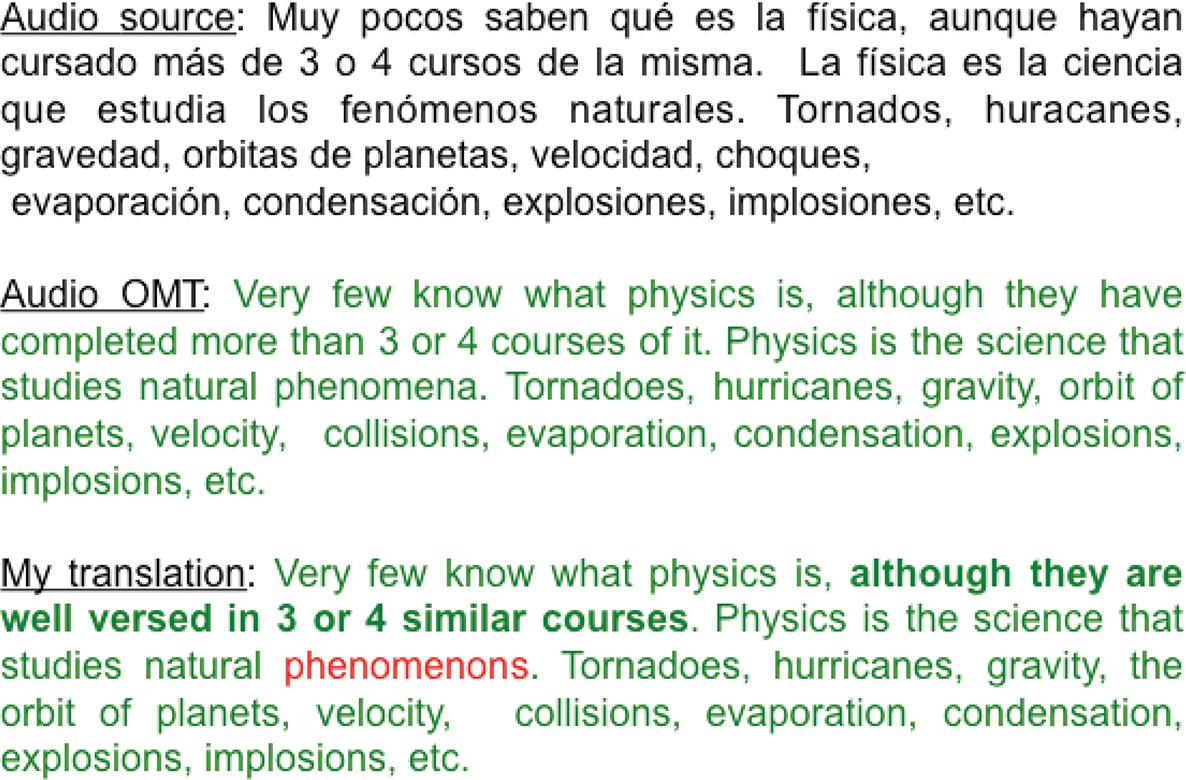 Students were aware of some of the OMT’s limitations mentioned previously. They experimented both with audio recordings and with their own voices, and in this regard, a student from Northern Ireland made a sarcastic comment about the OMT ‘not picking up her accent’. Overall, during the face-to-face session, it seemed students did not find audio OMT very useful. Amongst the reasons they provided were the following: because it cannot make out exact sounds, just picked up occasional words, not sentences or specific terms, skipped words, did not make sense, it contains too many errors up to the point that some said they were better off understanding the video themselves. The only exception is illustrated in Figure 7. It shows an example from an advanced student of Spanish who chose a Spanish scientific audio from her main subject of study (Physics) with very simple vocabulary and produced a rather well-translated voice/audio output via OMT in the target language with almost no need for revision. The native English student stylistically edited the target language text in English.