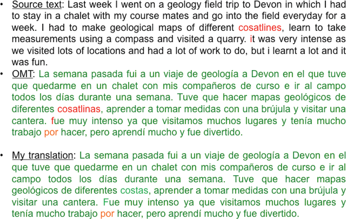 Since the majority of our samples are from advanced students of Spanish, reading comprehension is not a big issue for them, as shown in Figure 4, where orange and red fonts (depending on the severity) showed OMT’s errors and the student’s post-edited text (My translation) mistakes, respectively. Correctly translated utterances appear in green font. Understandingly, in their reflective comments, many of them commented that they can do better than the machine and they do not need the OMT output to help them comprehend. Still, as shown in Figure 5, students may have the odd comprehension error (seguida de: followed from), but, mostly, students edited the OMT output successfully improving the text with some stylistic changes.