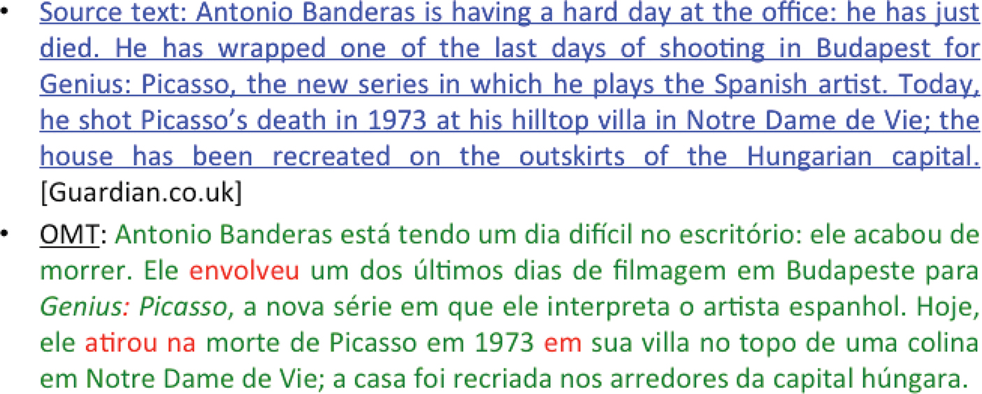 Figure 5. Example of an independent Portuguese into English reading comprehension task on current affairs via OMT.