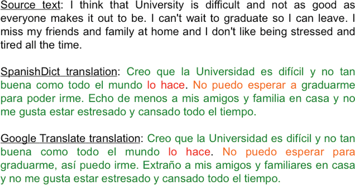 The intermediate level student example (see Figure 11) goes to show that students explored various OMT apps and sites, not just Google Translate, and evaluated their accuracy and contrasting various OMT output texts (SpanishDict, Reverso, Microsoft Translator, Skype Translator). For the English–Spanish pair, the translation quality happened to be rather similar across many of these OMT systems/apps in terms of language quality, as shown in this example.