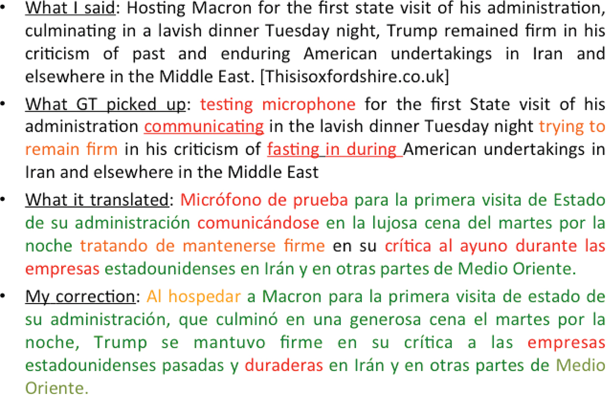 Figure 12. Example of voice translation input from the news, online machine translated (GT) output into the target language and post-edited output by a student.