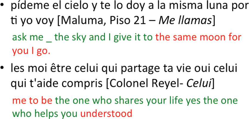 As mentioned before, students were imaginative in their use of OMT and some of them even experimented with lyrics. The example in Figure 13 comes from beginners’ students of French and Spanish, also learning English at university. As we know, lyrics are very difficult to translate due to its slang use of the language, sometimes full of omissions, cleft sentences, idioms, inappropriate language, etc. This beginners’ student did not correct the English, probably because s/he did not know how to, but still s/he showed an interest in this particular use of OMT.