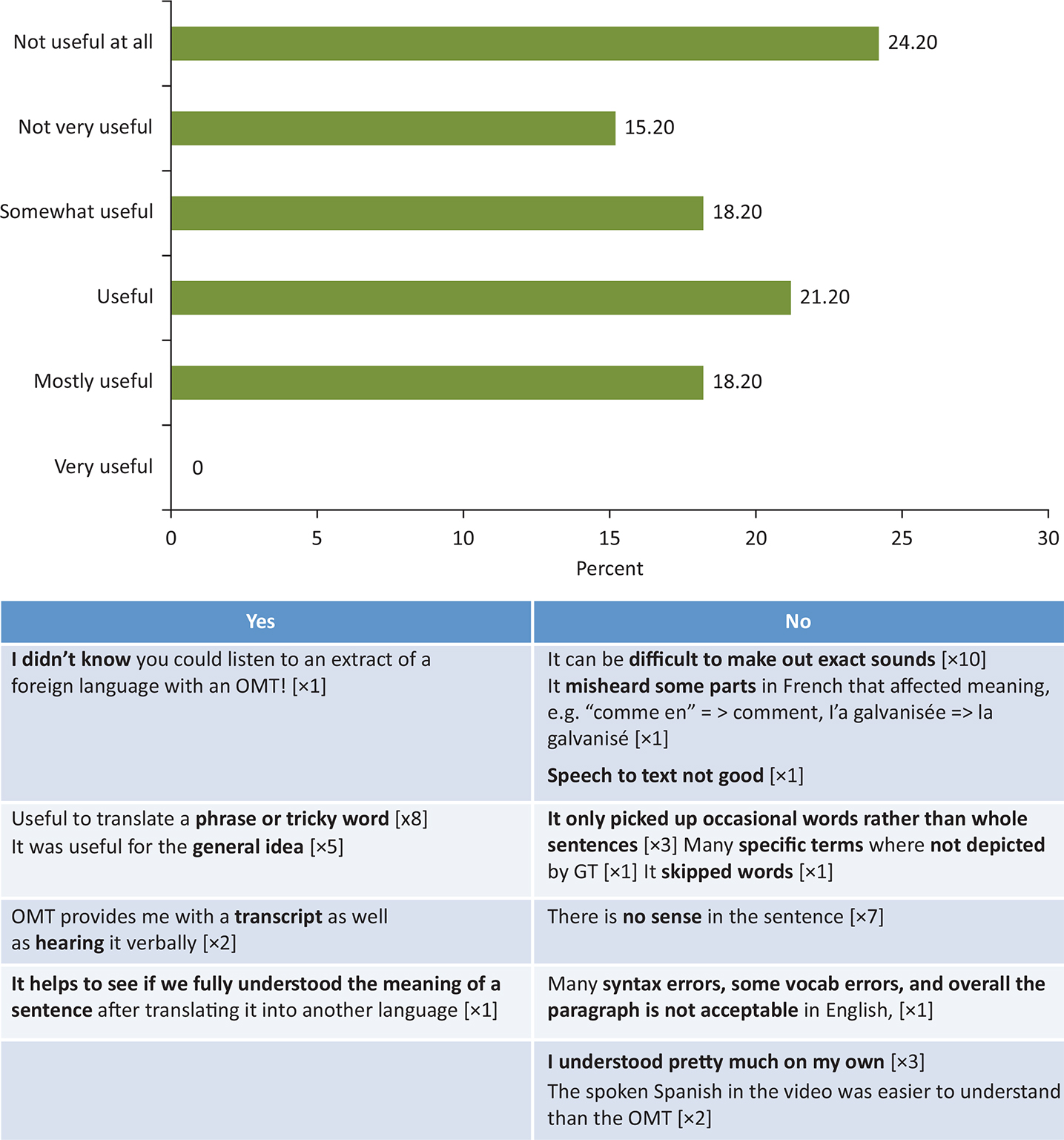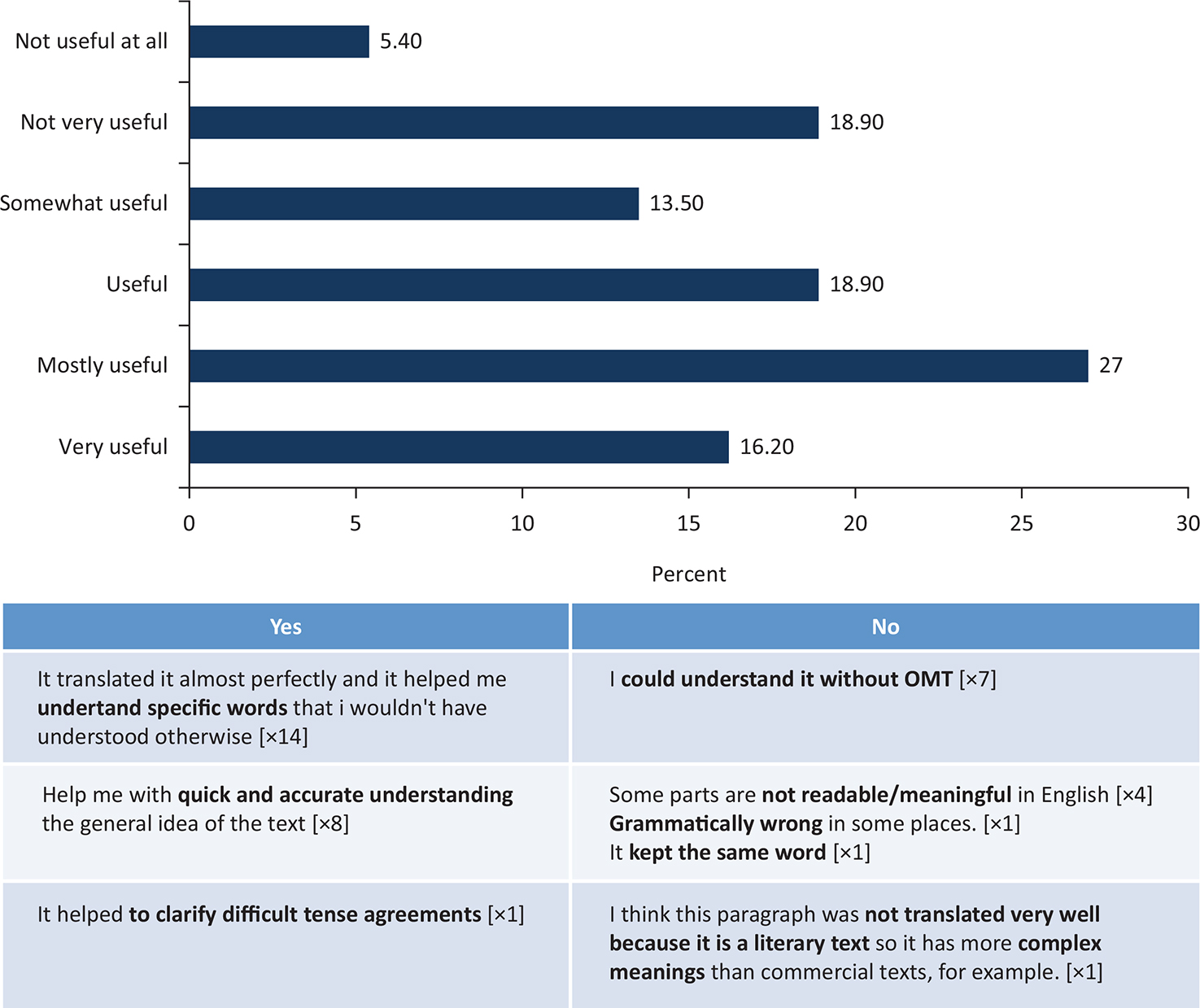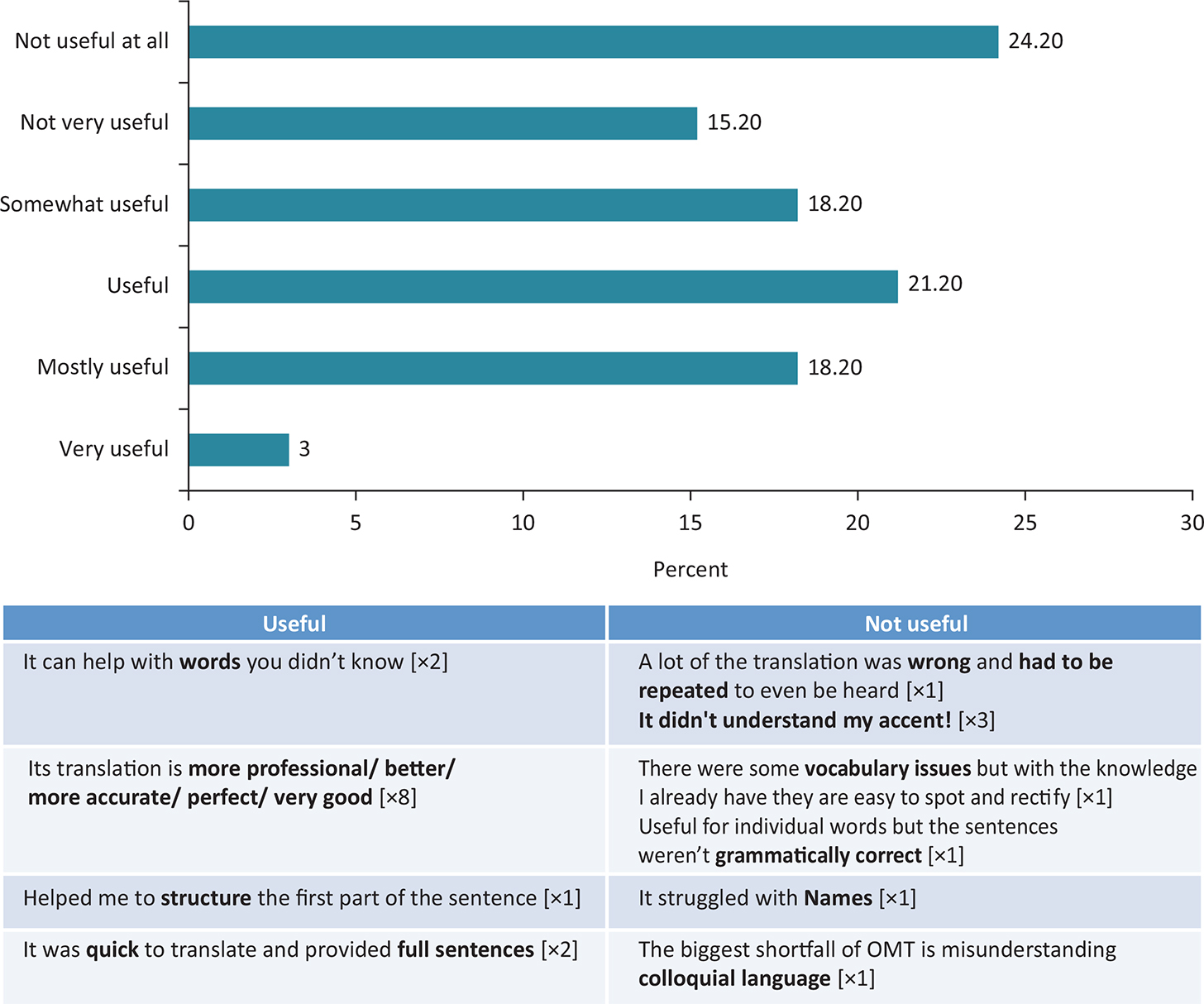 As shown in Table 9, the vast majority found the written OMT output mostly useful (44.1%) or useful (26.5%). They valued the various translation options provided by the different OMT systems/apps, and they also experimented with pre-editing the source text to see how this affects the language quality of the target text. In general, the OMT output seemed to them a quick and accurate translation, especially useful for vocabulary, grammar and structure, and (in their own words) ‘they enjoyed playing with the language and using OMT as a language checker’.