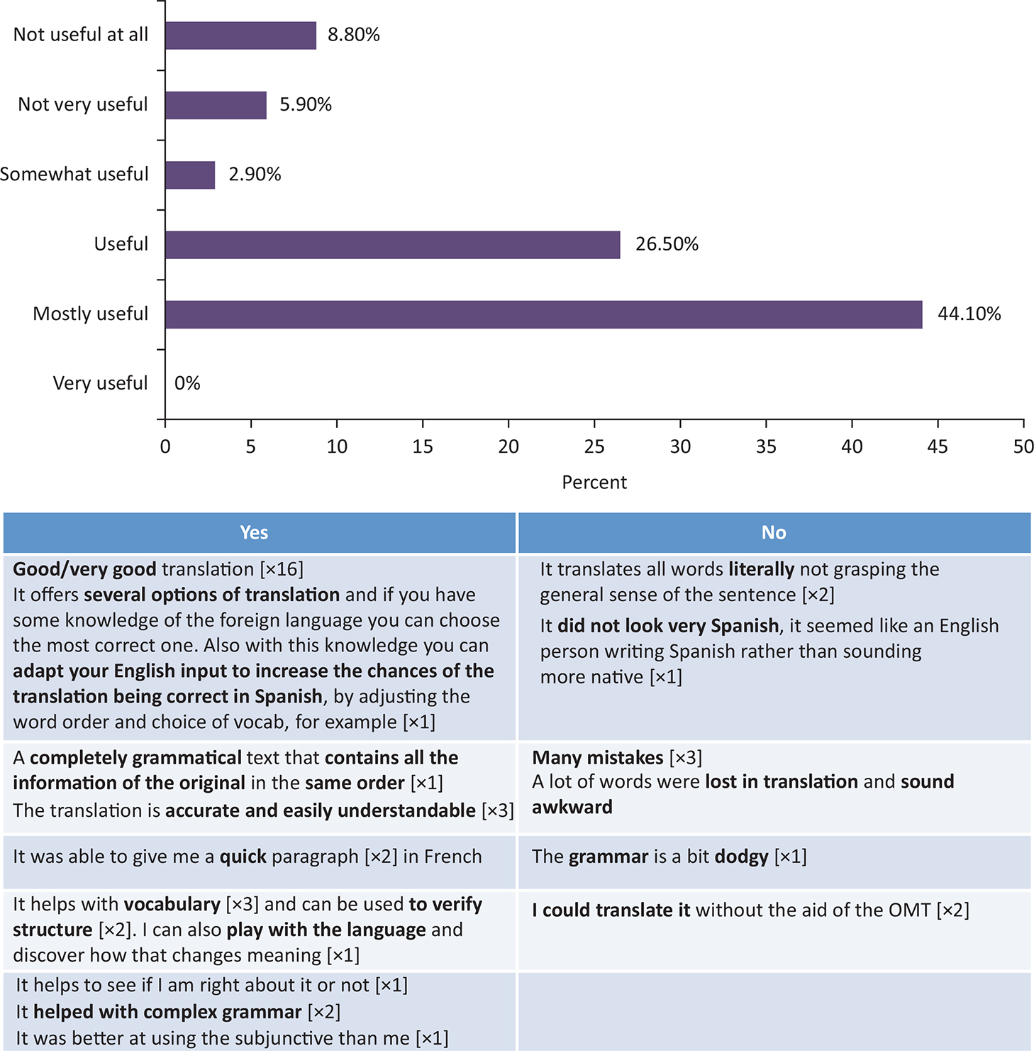Regarding translation evaluation, it is clear that many students have been exposed to this technology since they started learning languages in secondary school. There were quite a few comments along the lines of ‘[online machine translation] it has got much better since I last used it at school’. Students explicitly compared various OMT websites and/or apps and provided comments on their variable abilities. Comments vary from ‘SpanishDict is very helpful as its translations are quite accurate’ to ‘Google Translate can trip you up since it often ignores idiomatic phrases and literally translates word for word’. Another student commented: ‘Google Translate is OK for a language you do not speak, if you need to understand something. However, YouTube translation is hopeless’.