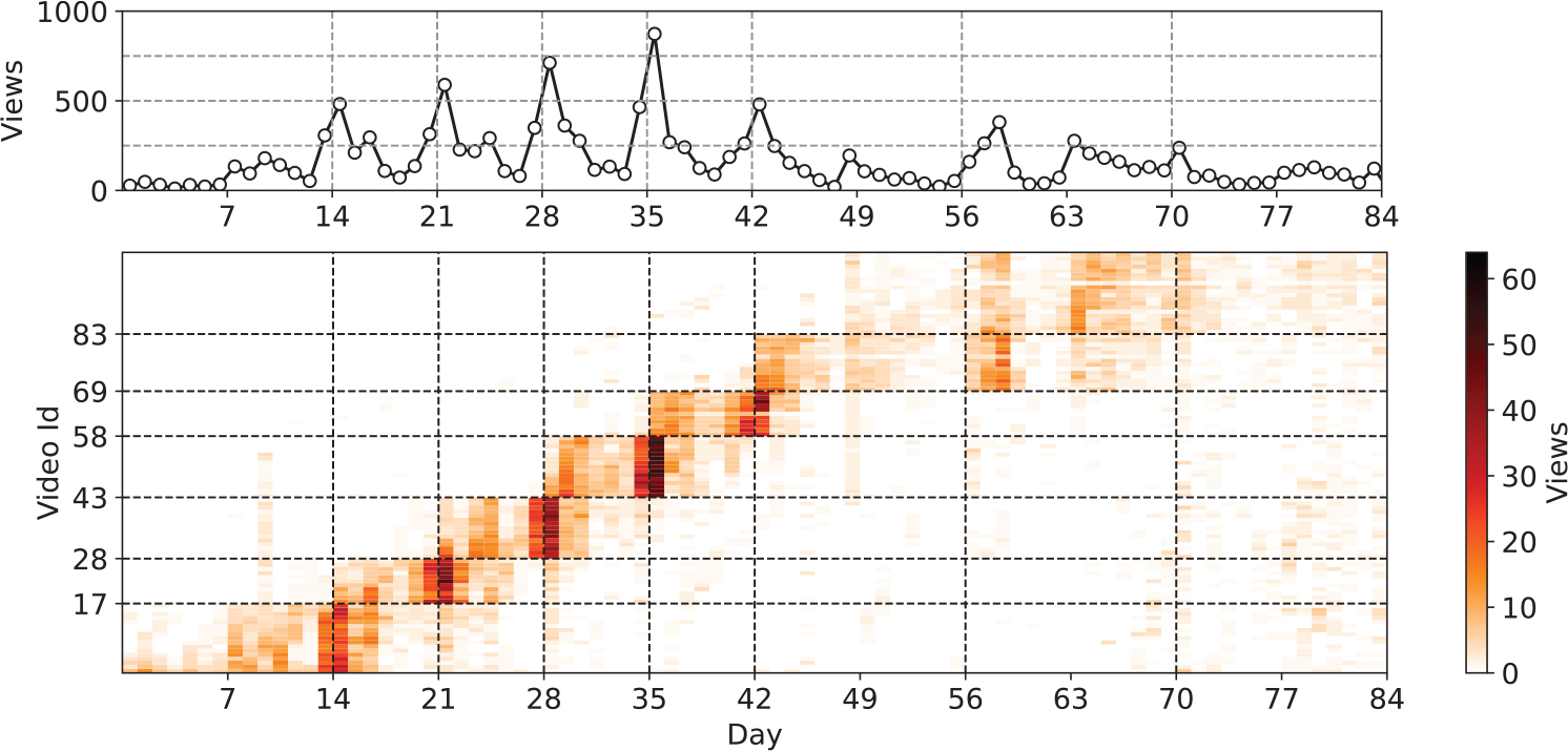 Figure 2. Video views for all days of the flipped classroom. The top figure shows total views whereas the bottom figure shows a heat map of view count for each video. A darker colour of red represents higher number of views.