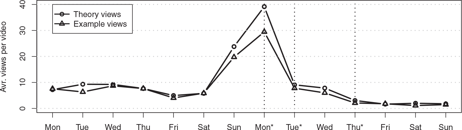 Figure 3. Average video statistics for Weeks 2 through 6 per video relative to the days where the students were supposed to watch the specific video. The vertical dotted lines represent days with mandatory assignments (group assignments on Monday and Tuesday, and problem-solving assignment on Thursday).