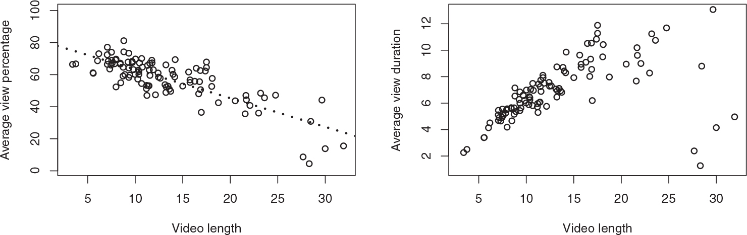 Figure 5. Left: Average percentage viewed of a video versus video length (measured in minutes). Pearson’s r = –0.81 (p < 0.001) with regression equation y = 81–1.8×. Right: Average view duration (in minutes) versus video length.