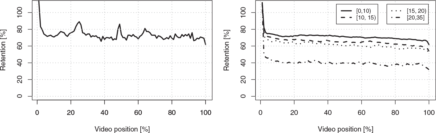 Figure 6. Left: example of a retention graph for a single video. Right: Average retention for different video lengths. A linear regression showed slopes of -0.066, -0.092, -0.103 and -0.054 for video lengths [0,10), [10,15) [15,20) and [20,35] min, respectively, when excluding the first and last 5% of the video positions.