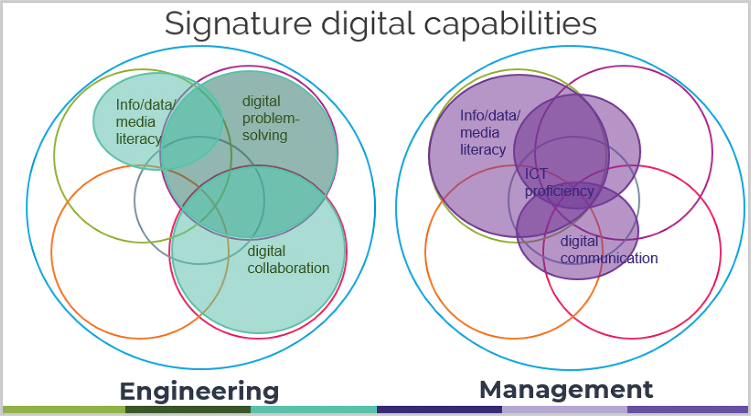 This study set out to explore how the six DigiCap elements are conceptualised in two subjects, with the expectation that certain elements might be more prominent than others, and in different ways. Findings suggest that disciplinary digital practices align with their signature pedagogies. Engineers are collaborative problem-solvers, drawing on scientific and mathematical knowledge (Figure 6). Accordingly, collaboration, problem-solving and information/data literacy are its most typical capability elements. In contrast, managers analyse/interpret information/data for communication and decision-making; this tends to be an individual endeavour. Digitally capable managers concentrate on information/data literacy, digital problem-solving and communication (Figure 6).