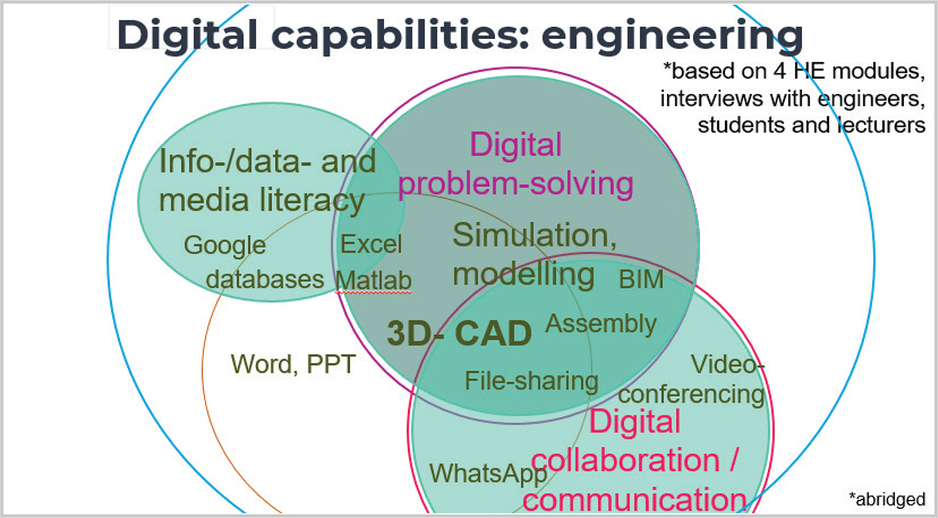 (4) Digital communication and collaboration – Engineering routinely collaborate in teams, produce and share digital product specifications, presentations, reports, designs and visual artefacts. Digital collaboration capabilities are facilitated by staff, for example setting up institutional tools, whilst allowing collaboration to emerge organically according to the teams’ preferences. Students use ‘high street-tech, communication software, and it is just so second nature, we don’t even deal with it’ (ENG2-Mike). Staff feel that what students need guidance on is group working, intercultural skills and professional communication/collaboration practices. Engineers consider various factors when choosing communication methods between teams and customers (face to face, telephone or digital). These include the size and location of the given company and its sites, the perceived formality of the conversation, client and team preferences and intercultural norms. For such synchronous collaborations, Skype, Lync and other platforms, for example See-and-Share, a remote image-sharing software, are used.