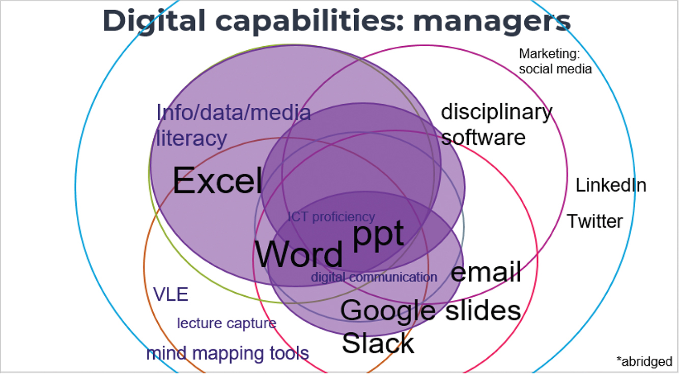(1) ICT proficiency for management students involves mainly on MS Office packages. Students are influenced by academics (Beetham, McGill, and Littlejohn 2009; Jones et al. 2010) in their technology adoption: one student on placement used Slack to keep in touch, as prompted by their lecturer. Managers use chiefly MS Office tools, with some variation of using additional tools. Office365 for collaborative working was not yet widespread at the time of interviews. Organisational practices are the main influencers of managers’ technology choice.