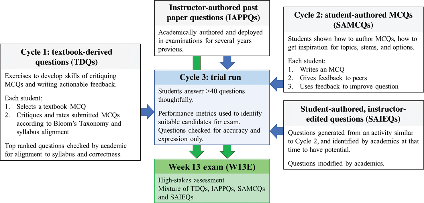 Activities for a second-year biochemistry cohort (over 600 students), were organised into three cycles (Figure 1), each with the outcome of generating or selecting questions for a summative, high-stakes, in-semester exam – the Week 13 examination (W13E). In Cycle 1, students were trained to dissect the intent and structure of existing MCQs, gain the skills to recognise attributes of strong and weak MCQs, and be empowered with the lexicon and phrasing appropriate for articulating their critiques. In Cycle 2, students were coached to author MCQs. By the end of this, each student should have written an MCQ, received peer feedback and edited their questions according to that feedback. In Cycle 3, we determined performance metrics using a low-stakes test and ultimately used that to inform the choice of questions in the W13E. This included student-authored questions from Cycle 2 (SAMCQs) and MCQs derived from three other sources: instructor-authored past paper questions (IAPPQs), textbook-derived questions from Cycle 1 (TDQs), and student-authored, instructor-edited questions (SAIEQs), which had been created in PeerWise exercises the previous year, selected for potential and revised by academics before deployment.
