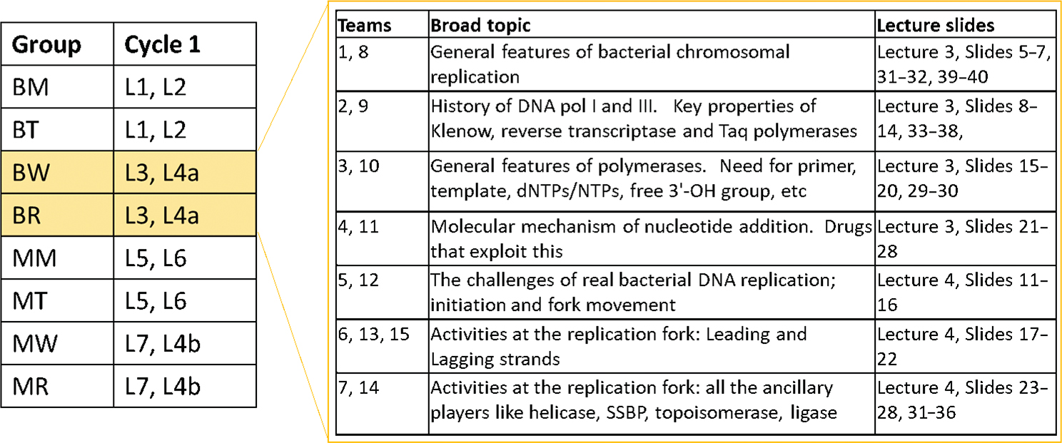 There were eight tutorial groups of 70–80 students, which were further split into teams of about six students. For example, BW and BR were allocated the topics shown on the right. This was rotated for Cycle 2 (e.g. BW/BR worked on L5, L6 in Cycle 2).