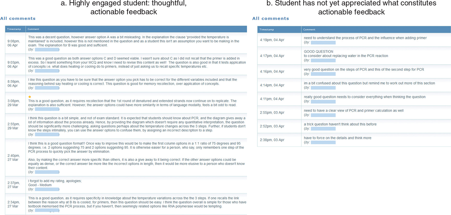 A key component of our strategy to train students to become effective MCQ authors was to encourage them to provide timely, actionable feedback and was therefore our focus in Cycles 1 and 2. PeerWise provides a report that collates all the contributions (questions, comments and replies) from one student on one page. It takes about 30 s to scan the comments and confirm their usefulness or otherwise (Figure 2).