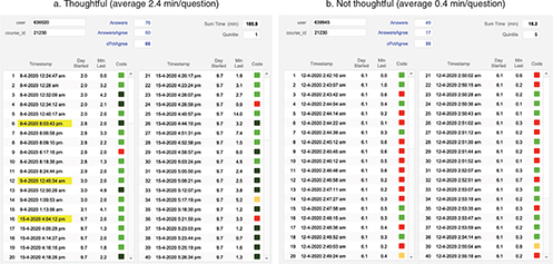 Figure 3. Custom dashboard developed to monitor student engagement in Cycle 3. Answering patterns are shown, including successful attempts on difficult questions (dark green), unsuccessful attempts on easy questions (red) and commencement of any sessions following the first one (yellow highlights). Data from students such as Student B were excluded from analyses of question performance.