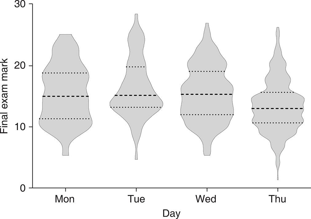 Figure 4. Performance of students in the final exam. The marks of the end-of-semester exam grouped by the day on which the students sat the W13E. The dashed and dotted lines represent the median and quartiles, respectively.