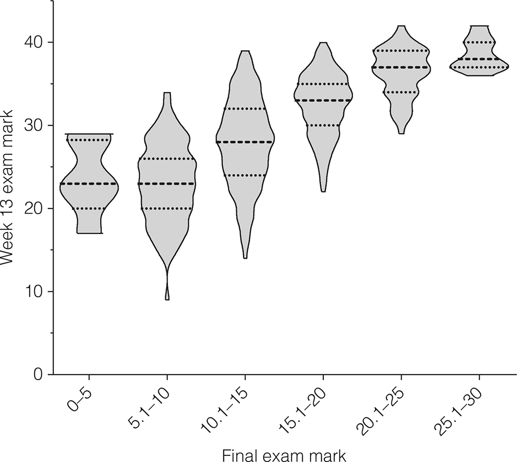 Figure 5. Comparison of student performance in the W13E and end-of-semester exam. Marks from the W13E were plotted for each student, grouped by their performance in the end-of-semester exam. The dashed and dotted lines represent the median and quartiles, respectively.