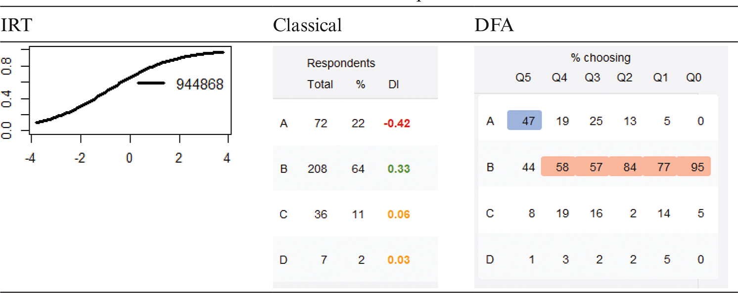 In the example (Table 3), the probability that a student of average ability will get this question correct is over 0.6, and over 95% of high-achieving students and less than 5% of students at the bottom end are getting it correct. The strong performance of this question is supported by the Classical analysis, which shows that 64% of the class chose the correct option (B) and that the DI for this option (and, therefore the question as a whole) was 0.33, for example, the proportion of students choosing option B was much higher in the stronger students than in the bottom sextile. Note that the false option, A, shows negative DI, which is desirable.