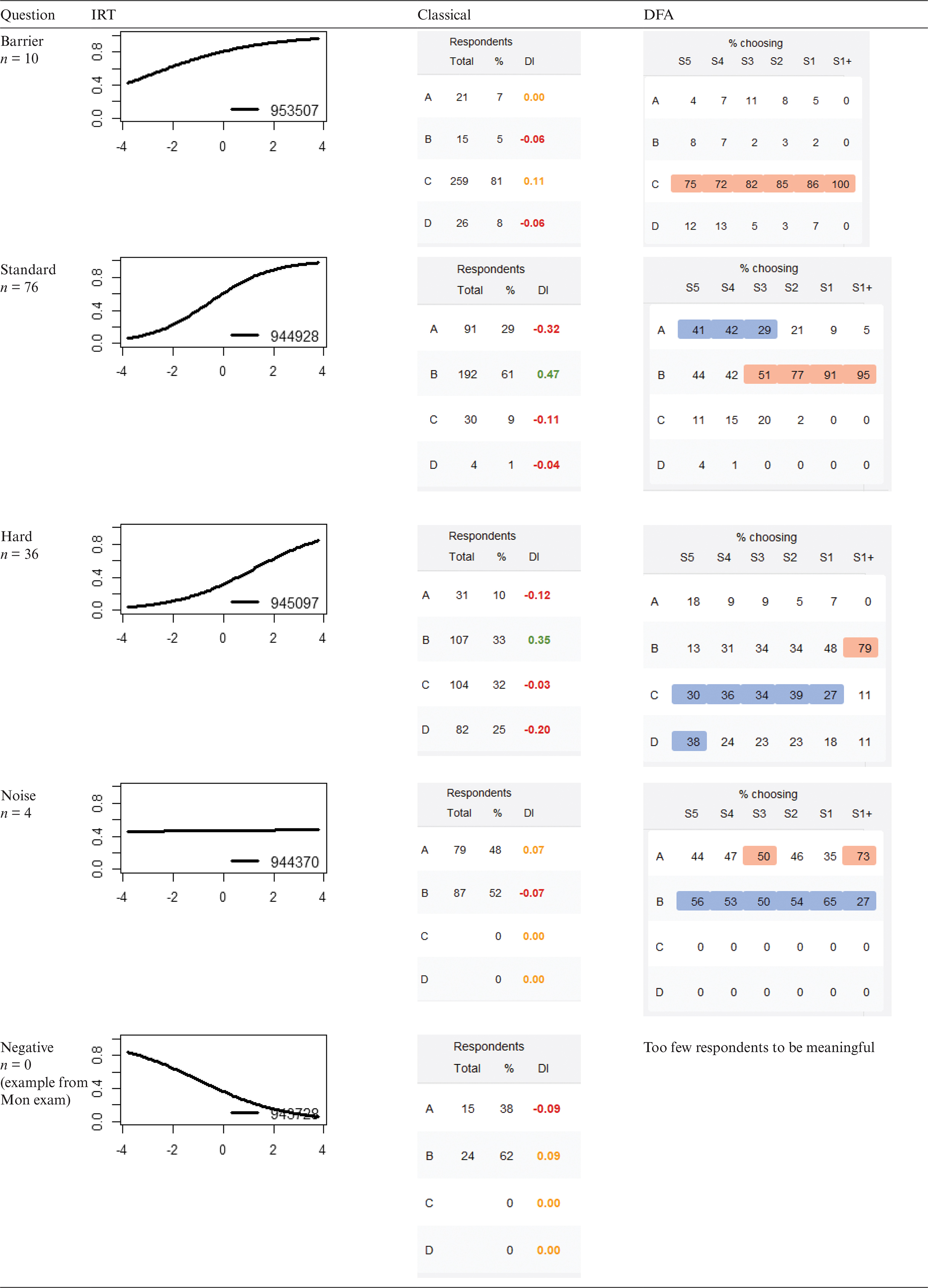 The worst type of question is revealed in the last row of the table. The IRT plot has a negative slope, the DI is negative and Classical analysis shows that students were choosing between two options. However, the better the student, the more likely they were to select the option that had been classified as incorrect. None of the 126 questions used in our analyses were classified in this way.