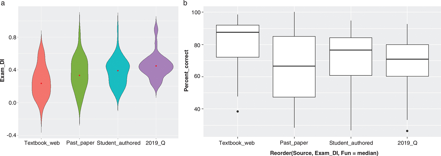 Textbook and web-sourced questions were also overall easier than student-authored and past paper questions (Figure 6b). As with DIs, the past paper questions also had a greater range of difficulties than the student-authored questions. Student-authored questions with and without contribution by an academic exhibited a smaller range and were of similar difficulty to the harder past paper questions.