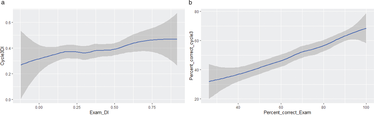 Figure 7. Comparison of question performance in a low-stakes and a high-stakes assessment. The (a) discrimination indices and (b) difficulty of the W13E were plotted against metrics calculated from Cycle 3.