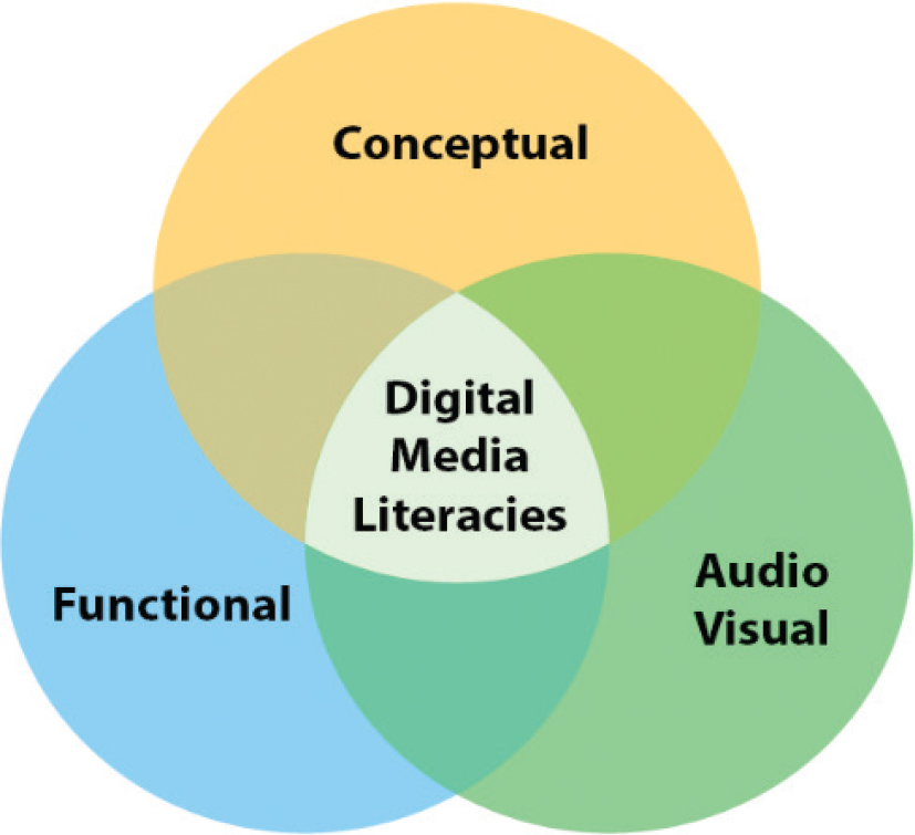 Figure 1. The digital media literacies framework. The skills needed for production of effective digital media which communicate a message effectively to an audience are at the intersection of three domains: conceptual, functional and audiovisual (Reyna et al., 2018b).