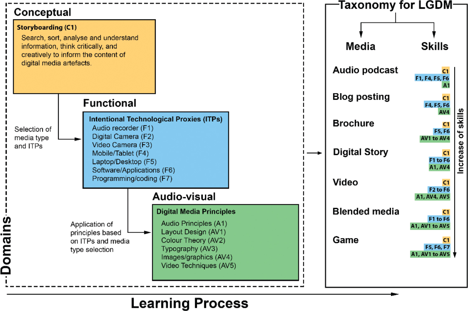 Figure 2. The taxonomy of digital media types for teaching and learning. Each digital media type is linked with the three domains that represent the skills required for the production of a compelling digital artefact.
