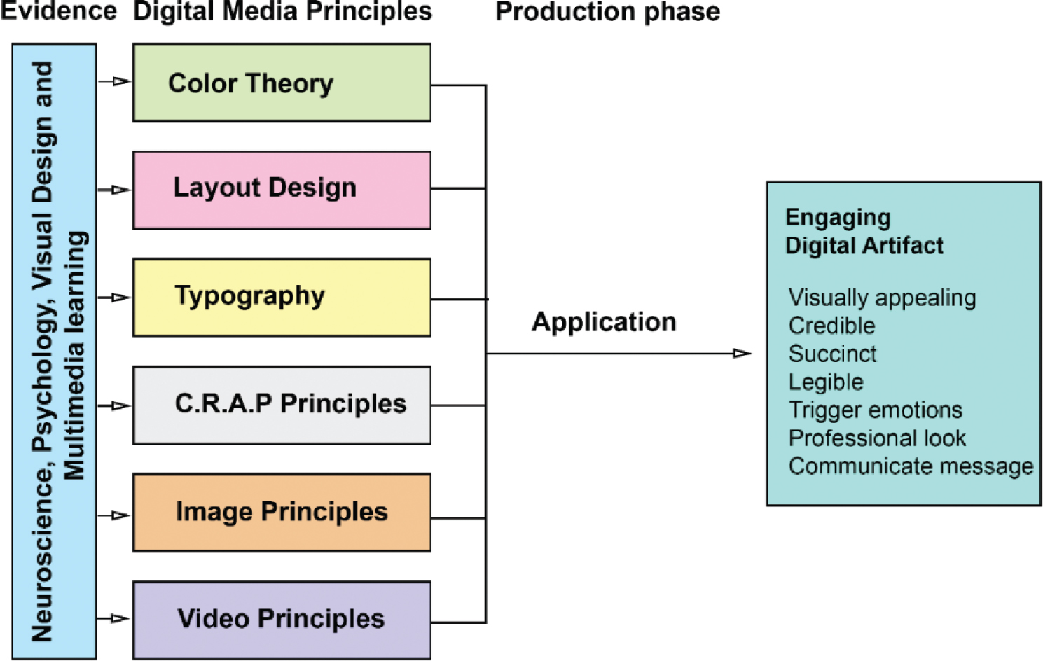The third model helps students and academic staff to develop expertise in digital media principles. Evidence from different fields, such as neuroscience (LeDoux 1989, 1992), psychology (Chang, Dooley, and Tuovinen 2002; Smith-Gratto and Fisher 1999), visual design and multimedia learning (Mayer 2008) informed the digital media principles model. The principles include layout design or distribution of design elements on the screen, colour theory, typography and the effective use of fonts (Malamed 2015); contrast, repetition, alignment and proximity (CRAP) principles of graphic design (Williams 2014), and image and video principles (Bowen 2013; Bowen and Thompson 2013; Stockman 2011) (Figure 3). The understanding and application of these principles in the production of digital media artefacts ensures legibility, credibility and effective communication of the message to the audience.