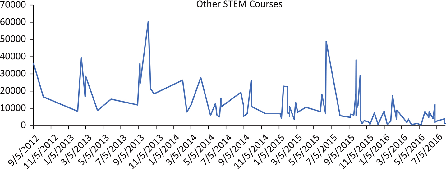 For other STEM courses, the increasing trend of students’ participation is located in January to March, July to September and September to November. That is, the increasing and decreasing trends of participation numbers for STEM courses in EdX are similar to the normal course schedule or calendar of higher education institutions (see Line Graph 3). When looking at the wave of all subjects, the curve peak for students’ participation in other STEM courses is different compared to the November to January periodical fluctuation of the curve of all subjects.