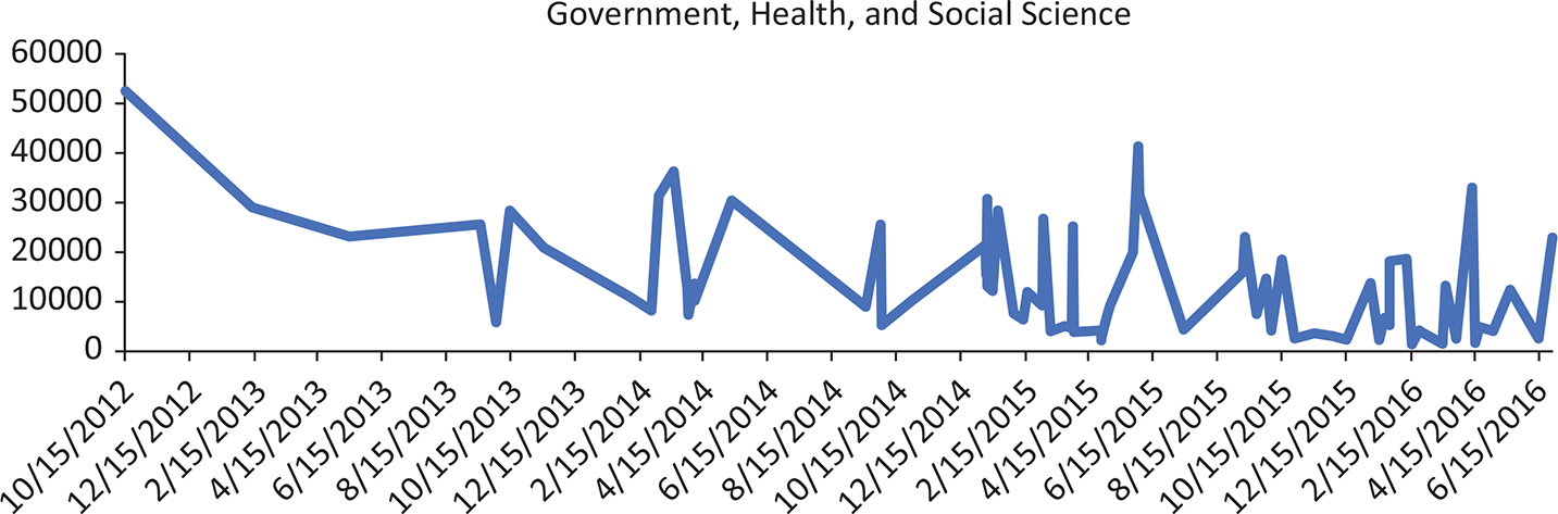 Line Graph 4. The participation number of EdX government, health and social science courses for each month from 2012 to 2016.