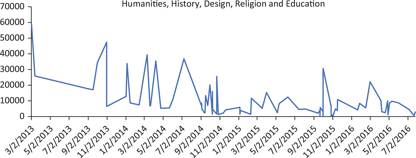 Line Graph 5. The participation number of EdX humanities, history, design, religion and education courses for each month from 2012 to 2016.
