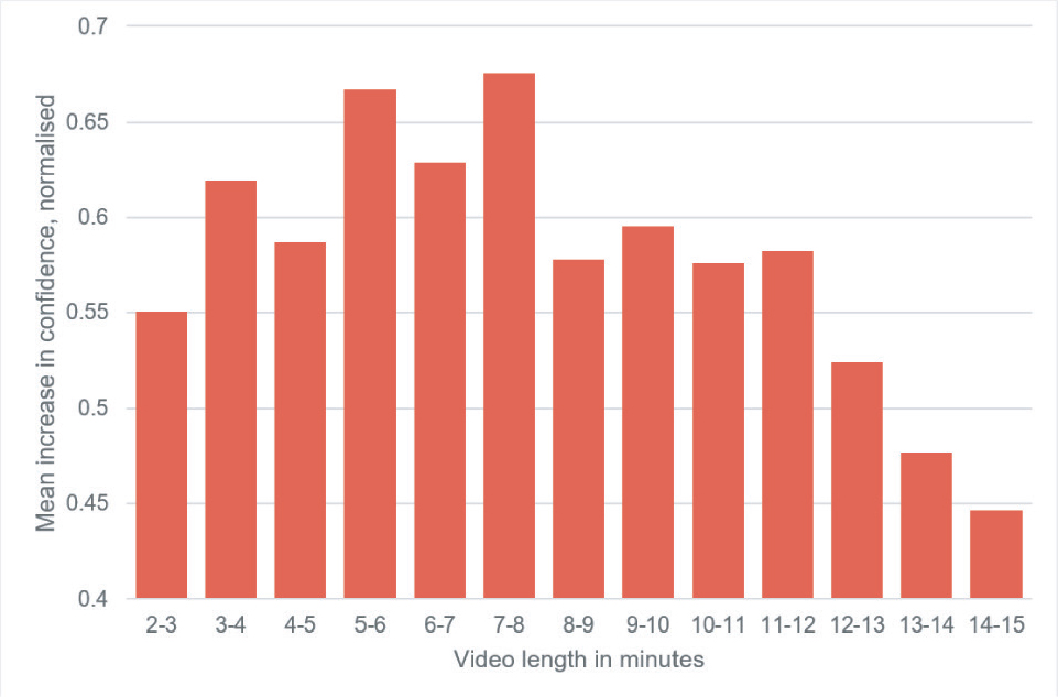 These normalised per-question values were collected into groups based on video length, using 1 min intervals. When a video was exactly on the division between two groups (a whole number of minutes in length), it was rounded into the upper division. The mean change in confidence for each group is displayed in Figure 1.
