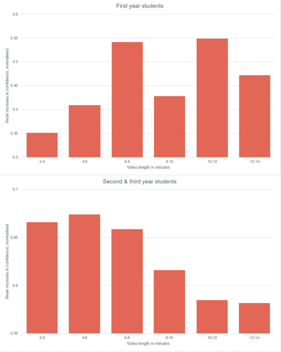 Our data identified video length as a significant factor in student engagement with recorded lectures, using self-reported confidence as a metric and broadly confirming the findings of Guo, Kim, and Ruben (2014). An optimum range in which students reported the greatest increase in confidence was identified at 5–8 min, slightly shorter than Guo, Kim, and Ruben’s 6–9 min. However our data set reveals that the year of study had a significant effect, with the needs of first year students differing from others. Among our students, optimum ranges were identified at 6–12 min for first year students and 2–8 min for second and third year students.