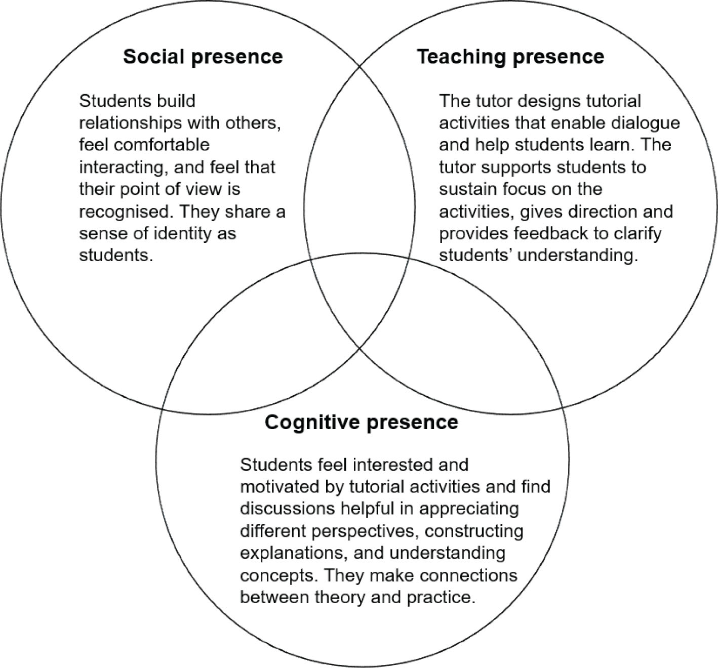 What made a difference in the positive experiences described was having not only teaching presence, but a focus on enabling social presence. In the most positive tutorial experiences that students narrated, students reported that they felt able to interact with others and that all students’ ideas were acknowledged. Students learned from each other, not just from the tutors. It was this combination of both teaching presence and social presence that helped to generate positive tutorial experiences with evidence of cognitive presence, emphasising the importance of a community of inquiry being a community where everyone learns from each other (Edwards, Perry, and Janzen 2011).