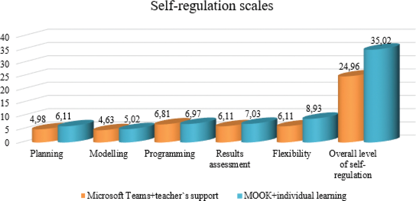 The results revealed that the overall level of self-regulation of students in group 1 (Microsoft Teams + teacher’s support) was average and amounted to 24.96 ± 1.32, and in group 2 (MOOC + independent learning), the level of self-regulation was high and amounted to 35.02 ± 1.44 (p < 0.05). The analysis of the level of self-regulation shows that the modelling and programming do not differ in the two groups. The other scales show significantly higher values in group 2 (MOOC): flexibility – by 46%, planning – by 23% and results from assessment – by 15% (Table 1).