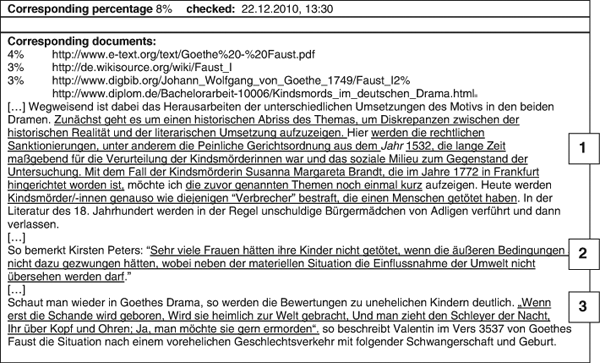We have to consider what level of reliability can be achieved by a PDS. The result of plagiarism checking contains information about correspondences with other text sources. The percentage of agreement between the detected source and the original source is shown along with the associated URL (Figure 4 and 5). Every match has to be evaluated – not every match is a plagiarism. In fact, in many cases corresponding parts were in fact not plagiarism, e.g. matches due to careless mistakes in quoting sources, definitions or legitimate quotes from classical literature, as shown in Figure 5. The PDS indicates plagiarism, but cannot prove it. The detected text parts become plagiarism only by the interpretation of the lecturer. When both plagiarism and mistakes are present, as in the example, it is not easy to decide.