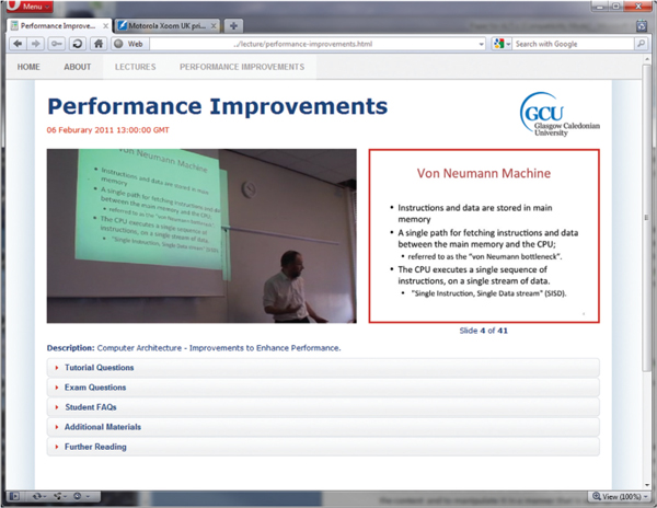This allows the students to navigate through the lecture content via the slides or the video which are synchronised together. Where this product differs from previous developments is in the areas shown underneath the lecture presentation. Firstly, they provide access to all of the related content in a single space. Secondly, they provide an alternative mechanism to navigate the content.