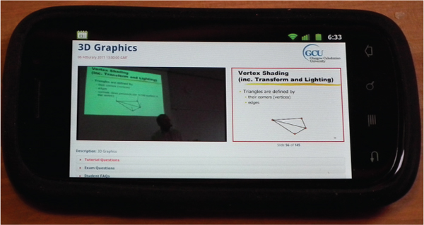 While handheld devices were not the focus of the original design, the interface was designed to support this form of access and the prototype can run successfully on many high end smartphones. Figure 4 shows the application running on a Samsung Nexus S Android reference smartphone. However it is recognised that the decision to use Flash as a video playback standard has excluded iOS devices from being able to access the full content. Part of the future development work will be a range of “Apps” optimised for mobile platforms, which will support offline access.